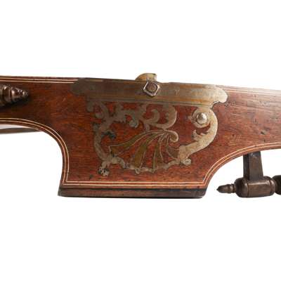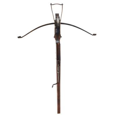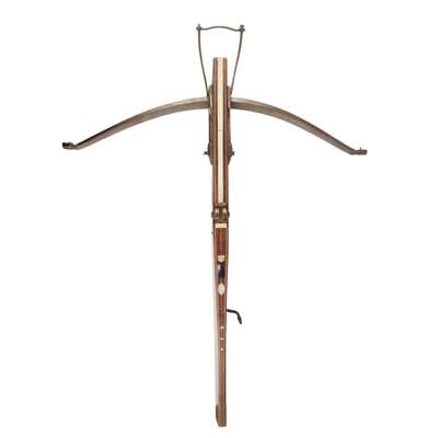 with heavy steel bow retained by steel brackets, large steel cocking stirrup, without string, slender tapering fruitwood tiller, inlaid with a bone stringing over the full length and mother of pearl decoration to the top, the sides inlaid with scrolling steel design, fitted with bone/staghorn flat/flight grove and wooden sight, brass bolt-clip, steel trigger with acorn terminal