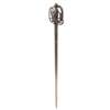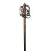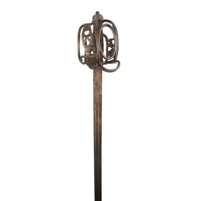 the basket formed of flat section bars, elongated side guards with hearts pierced on each plate, a dragoons loop and arched quillon, the pommel of flat bun shape, the wooden grip covered in black fishskin and twisted brass wire, the blade with two fullers, blade 80cm long