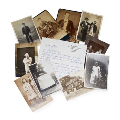 including photograph-style postcards and photographs of Grandmother Tiller, Dany & Lill, Harriet and Polly Clowes, Minnie Tiller, Walter Tiller, etc.; notes by H.W. Whanslaw with transcript and other material all in one folder (qty)