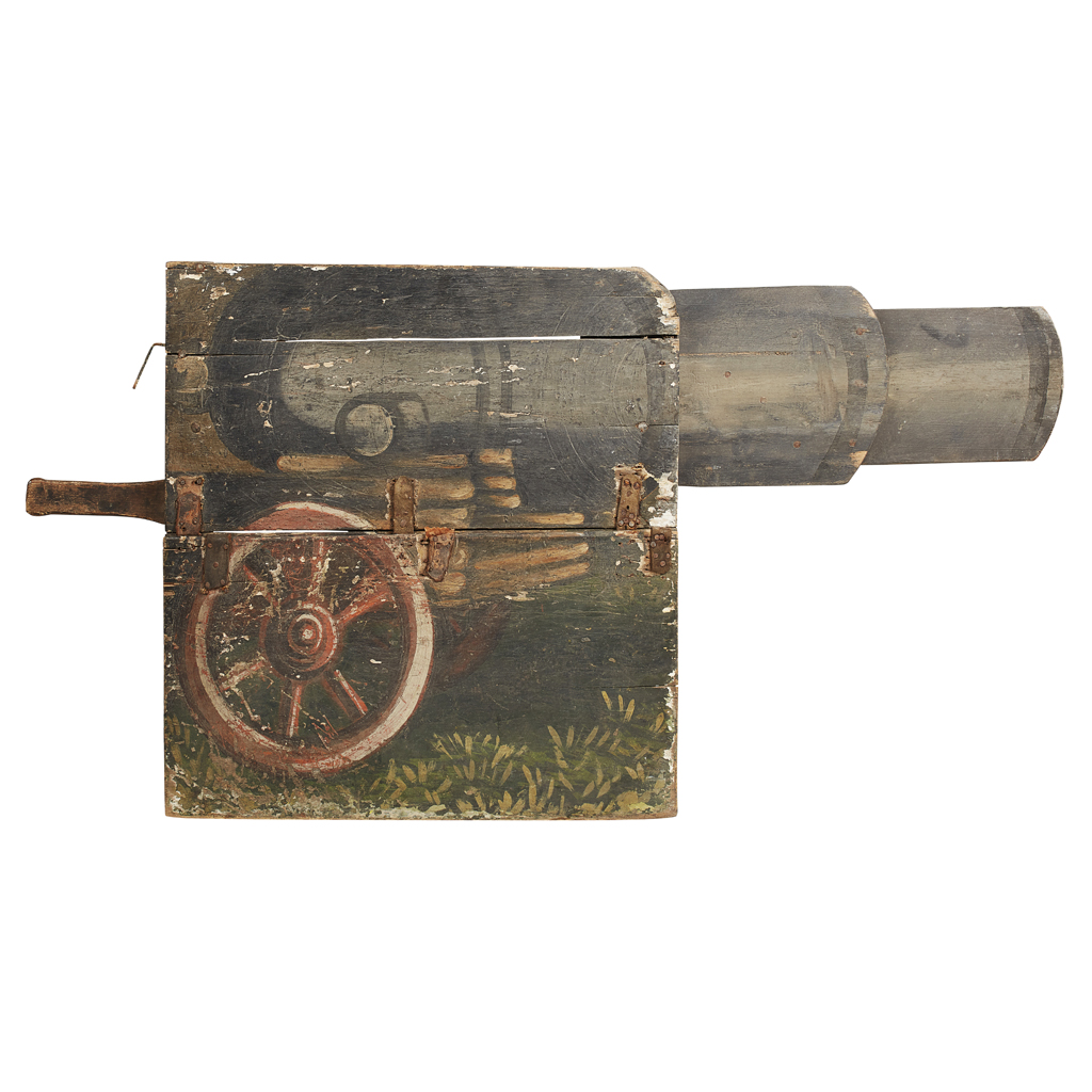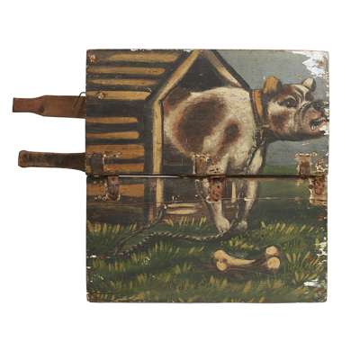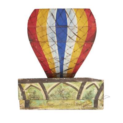 painted wood, cardboard and metal hinges, comprising DOG folding into cannon, 55cm x 80cm x 2cm; HOT AIR BALLOON, 45cm x 35cm x 12cm and BARBER'S SHOP with inscription 'shaving while you wait', 60cm x 45cm x 2cm (3)