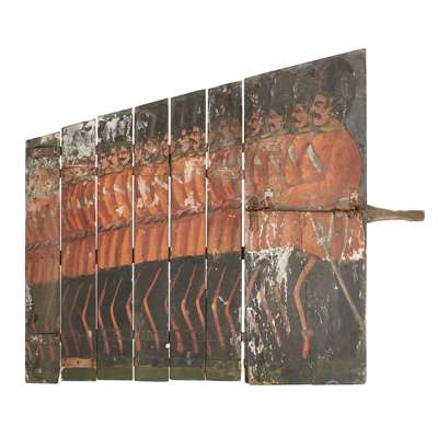 painted wood and canvas, comprising GUARD HOUSE folding into row of soldiers in red tunics, and ANOTHER the same (2)