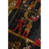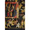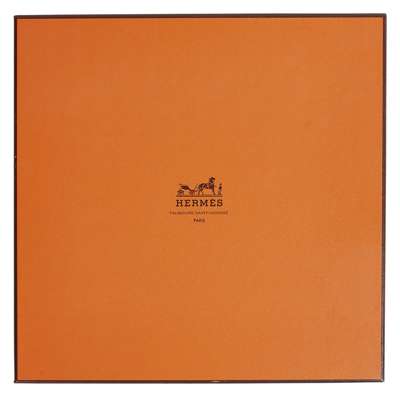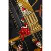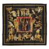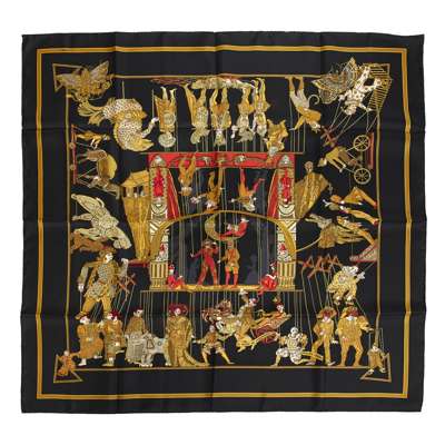 Black and gold, in original box, with depictions of acrobats and marionettes, silk with rolled edges