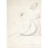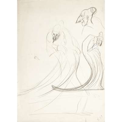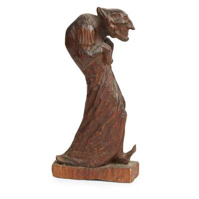 wood carving, 35cm high, together with a pencil drawing entitled The Communal Rat, dated 1971 (2)