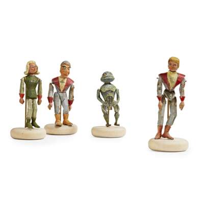painted wood, comprising, from left to right ZODIAC; PROFESSOR MATTHEW MATIC (without glasses); VENUS and an AMPHIBIAN, the largest figure 8.5cm x 2cm x 1cm (4)