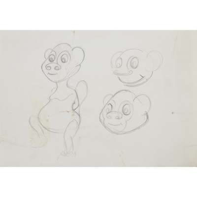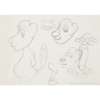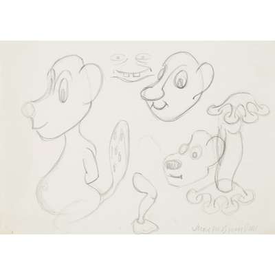 pencil on paper, 18cm x 25.4cm, and four others and a plastic toy figure of Zoonie, 17cm x 8cm x 6cm (6)