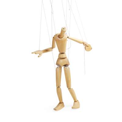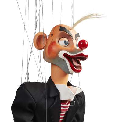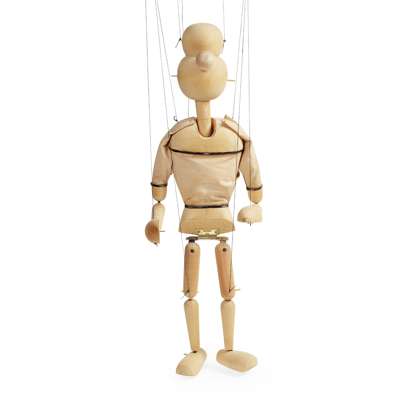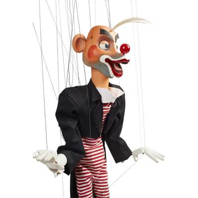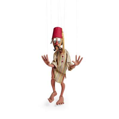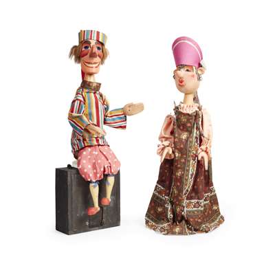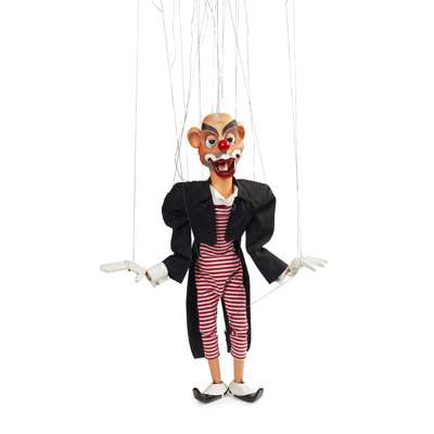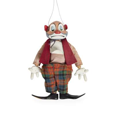 painted wood and fabric, comprising SAND DANCER , 70cm x 12cm x 9cm; CLOWN, 1980, 66cm x 23cm x 12cm; CLOWN AUGUST, 38cm x 13cm x 10cm; HEADLESS MARIONETTE, unpainted, 1980, 69cm x 15cm x 11cm; carved HEAD, 15cm x 10cm x 10cm; PETRUSHKA, 70cm x 18cm x 14cm; ALKULINA, 76cm x 19cm x 13cm; TRICK PUPPET of a goat changing into a devil, 60cm x 14cm x 16cm; Japanese style MARIONETTE, unclothed and unpainted, 59cm x 16cm x 10cm; another MARIONETTE, unclothed and unpainted; and a rod puppet of BUDDHA, 1960, 74cm x 24cm x 8cm (11)