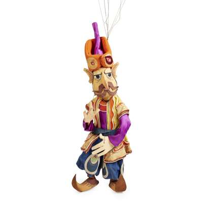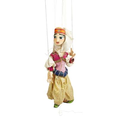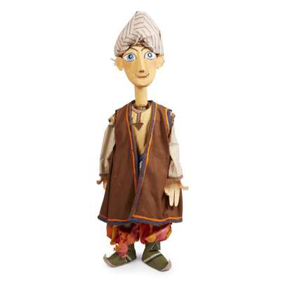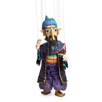painted wood and fabric, each with split bamboo hand control, comprising ALADDIN, 90cm x 22cm x 15cm; FEMALE CHARACTER, 77cm x 20cm x 12cm; VIZIER, 84cm x 30cm x 20cm and MALE CHARACTER, 85cm x 25cm x 15cm (4)