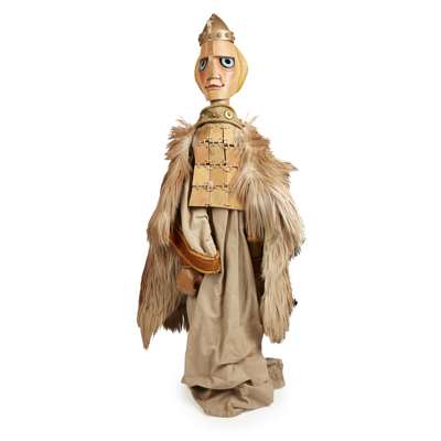 wood, fur, metal and fabric, comprising MALE VIKING, 110cm x 41cm x 21cm; SVEN, 110cm x 34cm x 44cm and YOUNG VIKING, wearing fur cloak and helmet, 109cm x 26cm x 15cm (3)