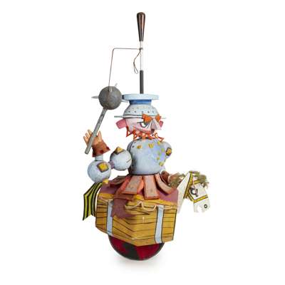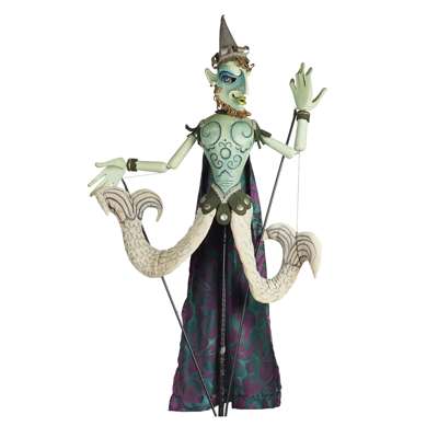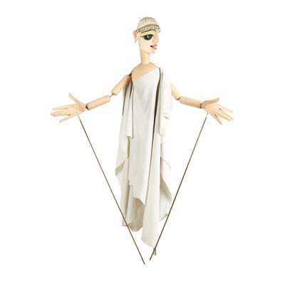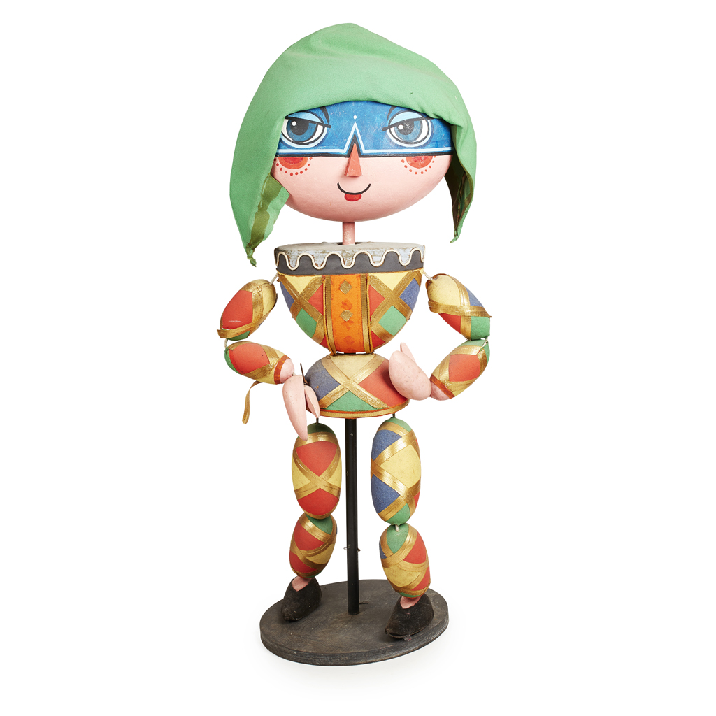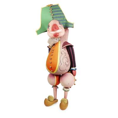 wood and fabric, comprising HARLEQUIN and POLICHINELLE from 'La Boite a Jojoux', Simon Rattle and The London Sinfonietta, 1982, each circa 115cm x 40cm x 25cm; CEPHESIS from Narcissus, 104cm x 50cm x 15cm and NIOBE from Narcissus, 98cm x 20cm x 10cm; NARCISSUS, 100cm x 65cm x 20cm; BARON BUMPH from Til Eulenspiegel, with colander on head holding mace and riding horse, 130cm x 68cm x 30cm; ASIAN puppet (no measurements) and PINOCCHIO, 64cm x 24cm x 17cm (8)