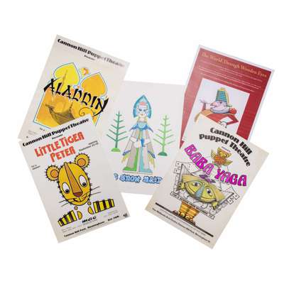 works on paper, photographs and prints, comprising pen drawings, brush drawings, pencil drawings, sketches, applique works, gouaches, graphics, including designs for productions of Aladdin, the Ugly Duckling, The Snow Queen, Cinderella, Buratino, Goldilocks, Pinocchio, Buratino, Hoffman's Tales, Jungle Book; Giant Witches and Fighting Men, Firebird, Hansel and Gretel, The Frog Princess, Love for three Oranges, etc., etc.; posters for Cannon Hill productions and photographs of live Cannon Hill production (large quantity)