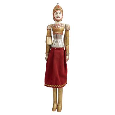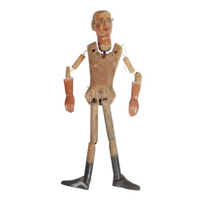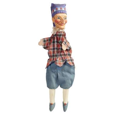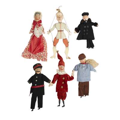 painted wood and fabric comprising KASPAR HOENSTEINER by Till de Koch, 60cm x 15cm x 10cm; BELGIAN KNIGHT, 66cm x 13cm x 8cm; FIVE GERMAN HAND PUPPETS relating to 'Kasperl Theater', man in black double breasted jacket, 32cm x 9cm x 7cm; man in uniform with moustache, 40cm x 8cm x 7cm; Kasperl dressed in red with white neck ruff, 42cm x 11cm x 8cm; female with lace shawl, 40cm x 10cm x 6cm; man with beard, 38cm x 9cm x 5cm; JUMPING JACK, 43cm x 12cm x 2cm; unclothed figure, 35cm x 13cm x 10cm; SIX SWISS KASPERL HAND PUPPETS with Kasperl, 30cm x 7cm x 8cm; Judy, 30cm x 7cm x 8cm; Devil, 30cm x 7cm x 8cm; Princess, 30cm x 7cm x 8cm; Wizard, 30cm x 7cm x 8cm and King, 30cm x 7cm x 8cm (15)