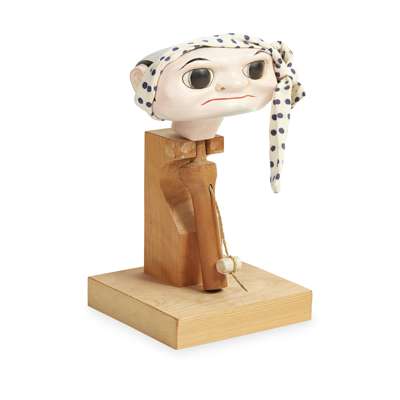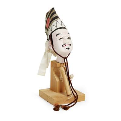 painted wood and fabric, with separate stands, comprising HEAD from 'Man to Crab' series, 23cm x 15cm x 8cm; SAMBASSO, Awaji Island, 24cm x 10xm x 22cm; two OTHERS, unfinished with moving eyes and eyebrows and PUKCHI, with personal dedication to John Blundall by the PUKCHI Theatre, Tokyo, painted wood and fabric, 45cm x 12cm x 10cm (5)