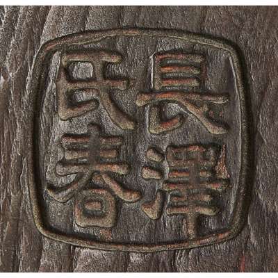 wood, gesso, paint, impressed seal mark on reverse, with fabric pouch