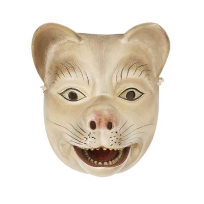hanoki wood, gesso, paint, with impressed seal mark on the reverse, with fabric pouch, comprising, DOJI, 20cm x 14cm x 9cm; RACOON, 17cm x 13cm x 8cm; Yasa-Otoko, 20cm x 13cm x 7cm and KOKUSHIKI-JO, 17cm x 13cm x 8cm (4)