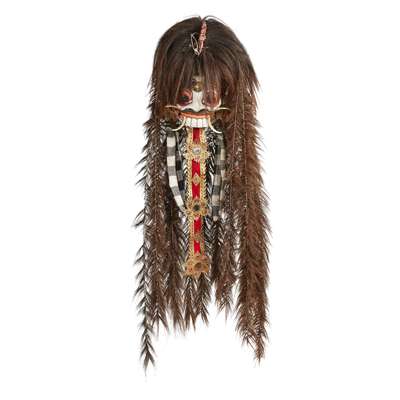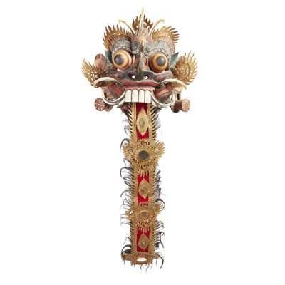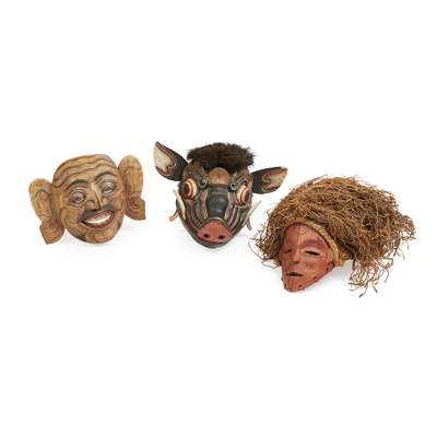 wood, paint and hair, comprising RANGDA mask with mane, 130cm x 30cm x 30cm; DEMON mask, 25cm x 26cm x 12cm; another RANGDA mask, 82cm x 30cm x 16cm; BOAR, 30cm x 35cm x 30cm; MALE with big ears, 30cm x 35cm x 14cm and MASK with big hair (6)