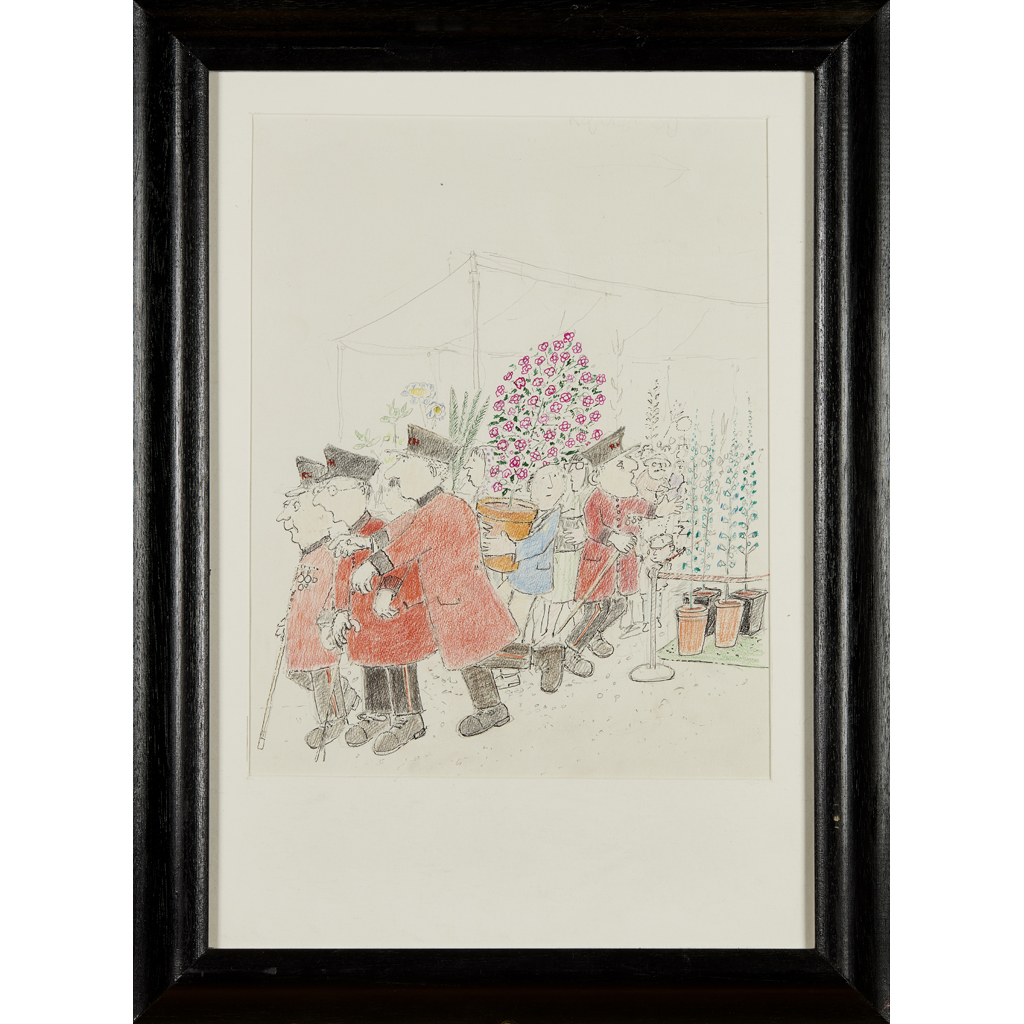 Pencil, ink and crayon, framed, signed on label verso