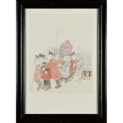 Note: The original illustration for 'England', first published by Jonathan Cape, London, 1992. 'England' and the later book 'France' were books for adults where John was attempting to define the essential characteristics of the two countries. He says of 'England' "I had to come to terms with the class system, which everyone claims has vanished but I'm not sure it has. Changes in behaviour are superficial. Young people have aspirations to be different from the previous generation but as the y grow up, and get older, they revert to being more like their parents"