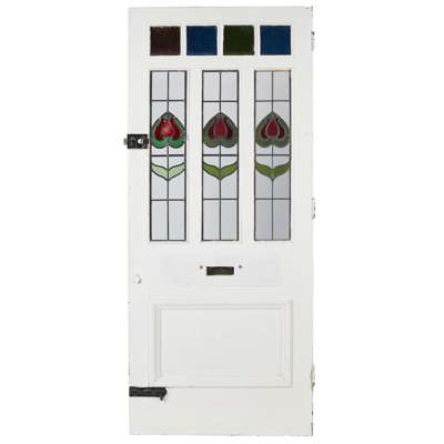 the panelled door enclosing three stained and leaded glass panels each depicting a stylised Art Nouveau plant form, with letterbox and handle
