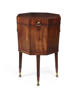 GEORGE III MAHOGANY AND SATINWOOD CROSSBANDED OCTAGONAL CELLARETTE