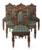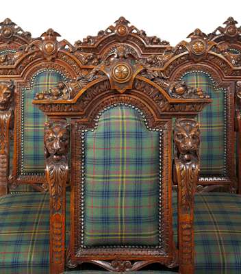 the top rail with ribbon and cornucopia carving, over upholstered panels flanked by lion masks, the upholstered seat over turned carved legs and apron (6)