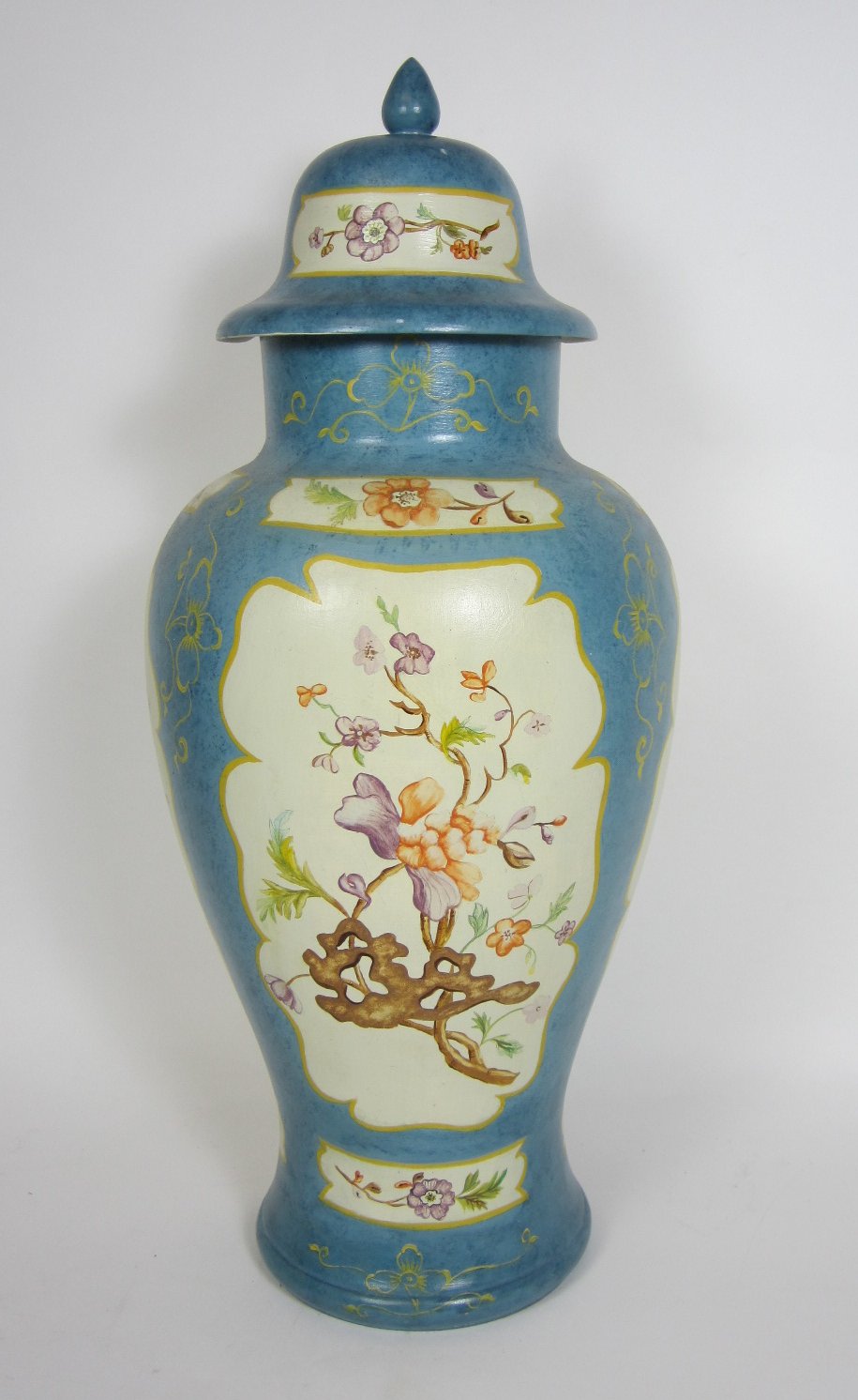 each earthenware vase of baluster form, painted with floral reserves on a blue ground, the giltwood brackets with acanthus leaf carving above ribbon swags, overall 84cm high approx; together with a further PAIR OF GILTWOOD BRACKETS, each of flared form with acanthus leaf carving, 30cm high (4)