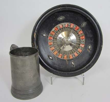 comprising of: a veneered foldaway book stand; a pen box; two ceramic inkpots modelled as curling stones; a leather cased measuring tape; a walnut veneered inkstand; a tortoiseshell letter opener; a roulette board; a pewter tankard; and a bronzed model of a stag, on a marble base (qty)