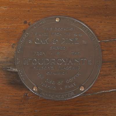 the platform top over two sectioned shelves and a base, bearing the label 'Salved from the "Foudroyant", Nelson's flagship', all raised on cross form feet, with wooden cased casters
