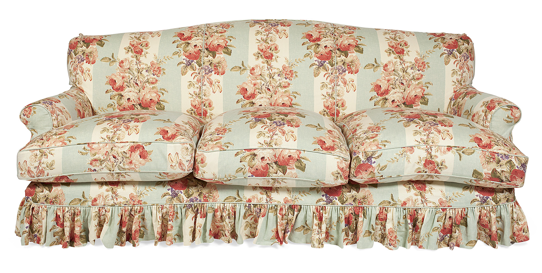 with floral upholstery, raised on brass shoes and casters (2)