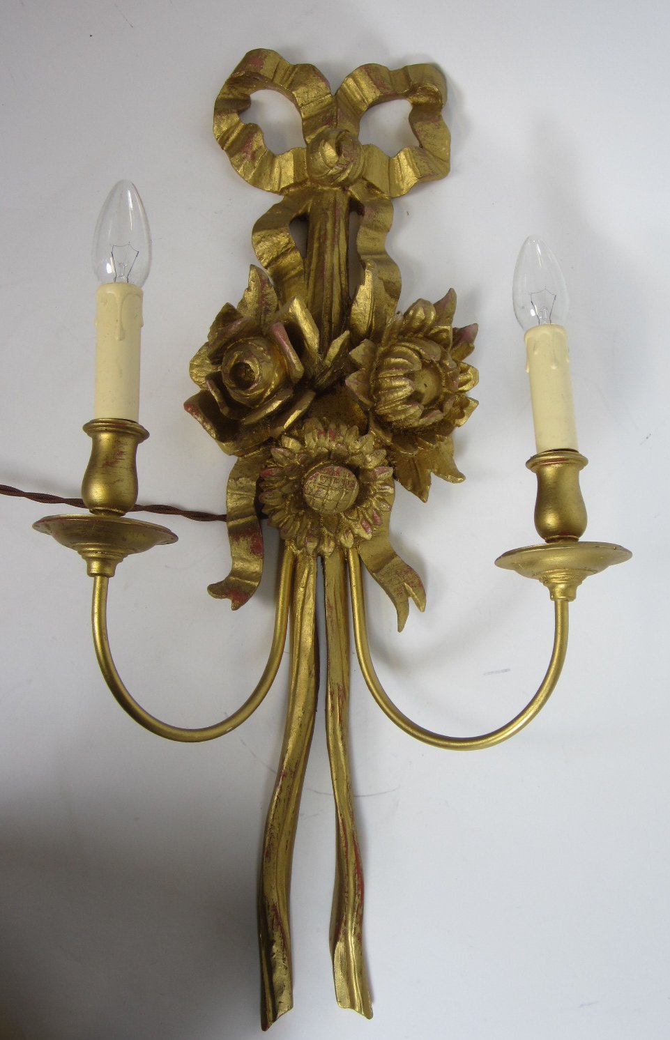 each with two branches flanking a carved ribbon swag decorated with flowers, wired for electricity (4)