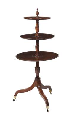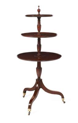 each with a turned column supporting three graduated trays with reeded edges, surmounted by an urn finial, all raised on a tripod base with boxwood stringing and brass casters (2)