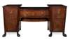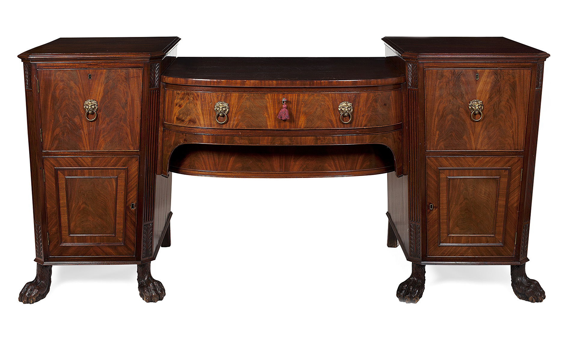 with twin pedestals of sarcophagus form, each with field panelled drawers, one enclosing a deep drawer adapted as a cellarette, the other revealing a fitted cupboard, each flanking the central bowed section with two drawers, all raised on hairy paw feet