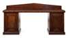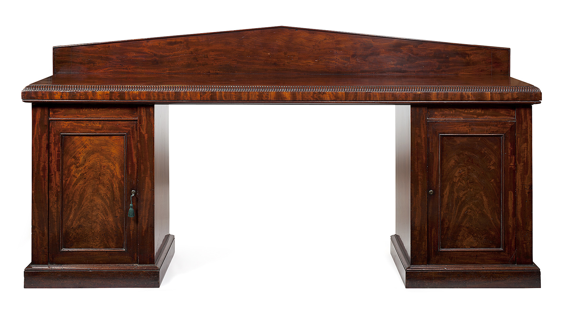 the platform top with an arched backboard and gadrooned edge over a twin pedestal base with field panelled doors, raised on a platform base