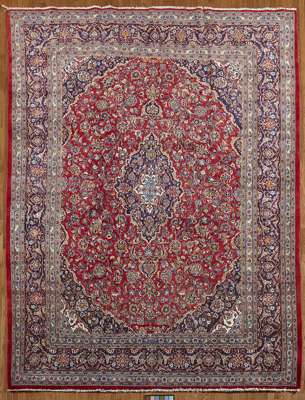 the red field with indigo, cream and light blue medallion, similar spandrels, within indigo palmette and arabesque vine border between bands