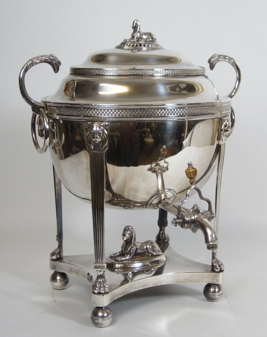 the decorative ovoid body with a tap, surmounted by a domed cover and sphinx finial, flanked by two bird terminals with loop handles, on a shaped base and raised on four ball feet