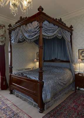 the canopy with three shell carved cartouches and acorn finials, over turned columns with acanthus decoration, the ends with carved pediments, fitted with blue damask and satin drapes with passementerie, all raised on bun feet