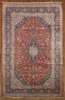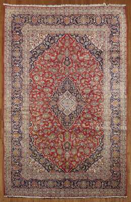 the red field with indigo, cream and light blue medallion, similar spandrels, within indigo palmette and vine border between bands