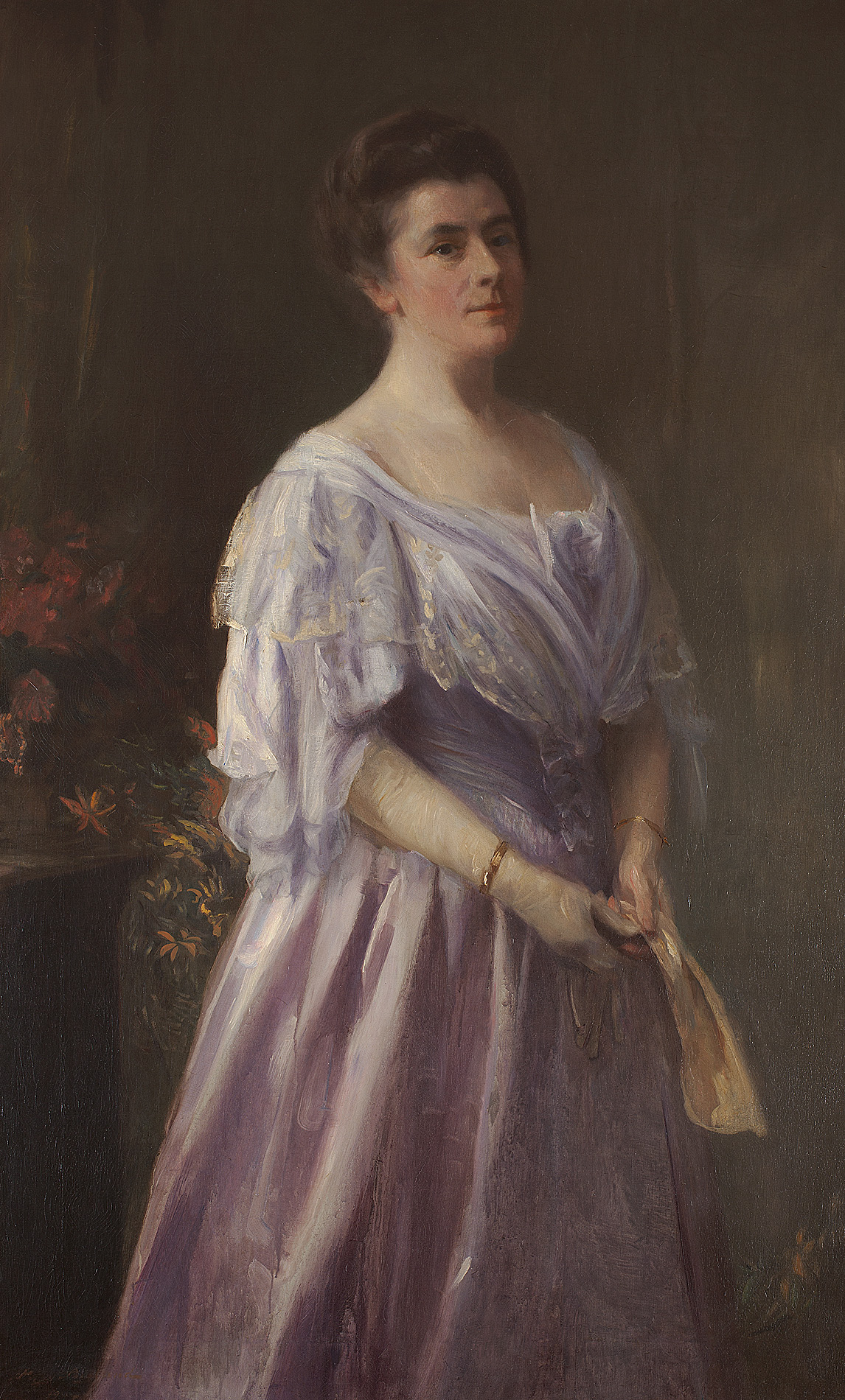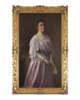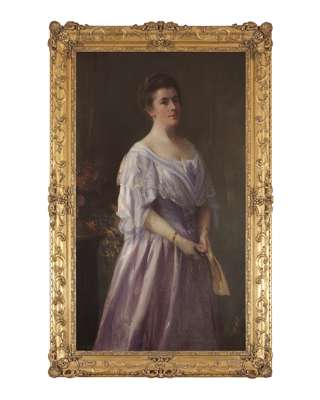THREE QUARTER PORTRAIT OF A LADY IN LILAC HOLDING A FAN