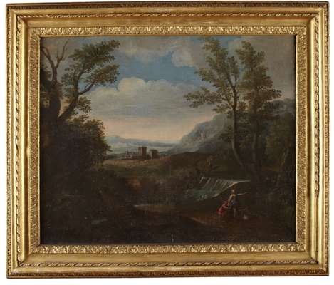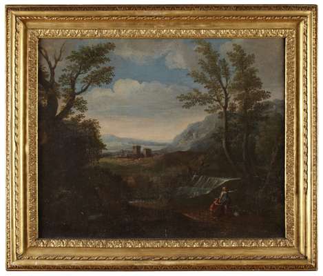 AN ITALIANATE LANDSCAPE WITH FIGURES RETURNING FROM THE RIVER