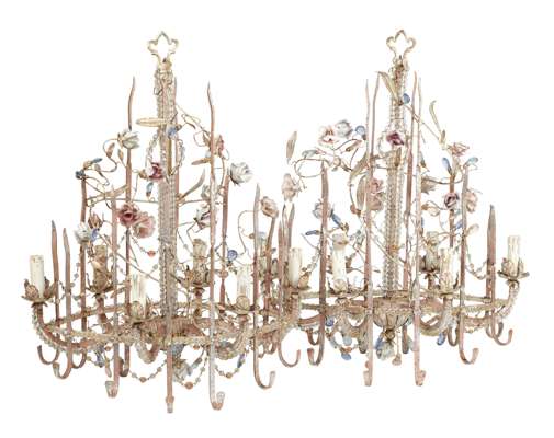 each with six outscrolling sconces below a pink and silver painted frame, supporting enamelled flowers, with decorative beads (2)