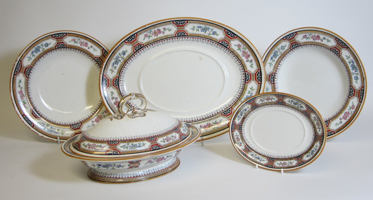 each piece decorated with borders depicting Chinese style flowers and stylised panels, with maker's marks, comprising of: a meat dish; six graduated ashets; various tureens, covers and stands; and a quantity of dinner, soup, and luncheon plates (qty)