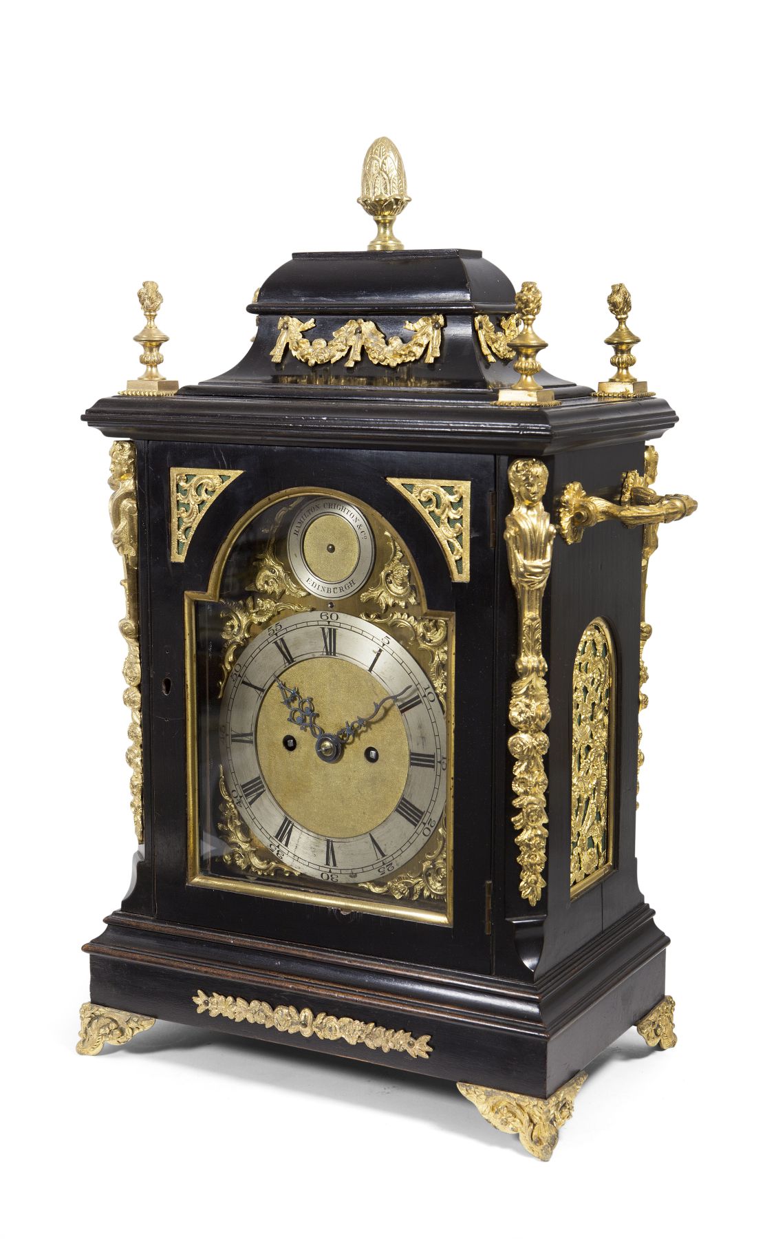the moulded top surmounted by an acorn finial and flame corner finials, above an arched brass and silvered dial with Roman and Arabic chapters, two winding holes and a maker's engraved boss and pierced brass spandrels, with gilt bronze corner mounts and a moulded base raised on gilt bronze feet; eight day movement striking on a gong