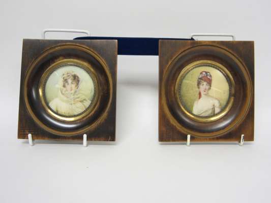 on ivory, depicting a gentleman and various ladies in contemporary costume, three signed, in square glazed frames (4)