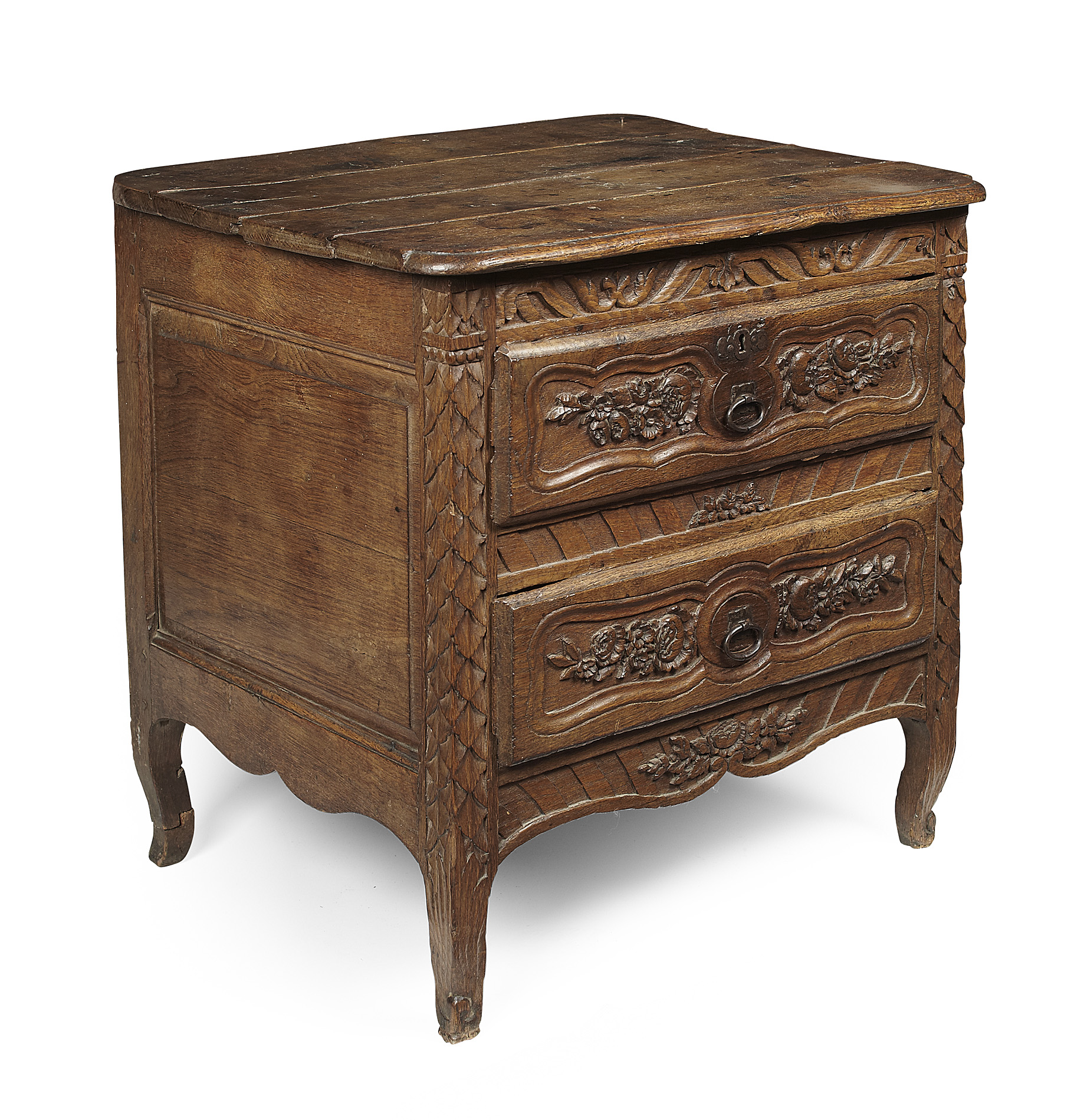 the rounded rectangular top with a moulded foredge over two drawers carved with floral sprays and flanked by leaf carved corners raised on cabriole legs ending on scrolled toes