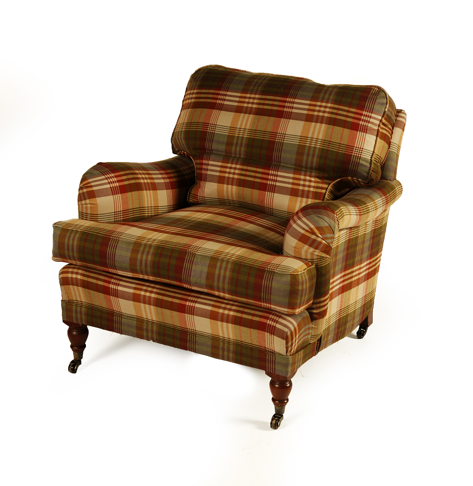UPHOLSTERED ARMCHAIR BEARING MAKER'S LABEL MULBERRY