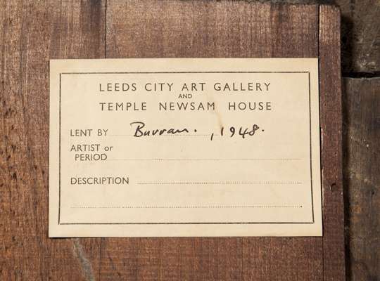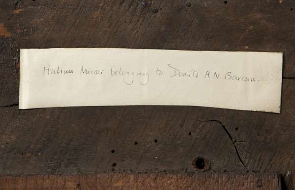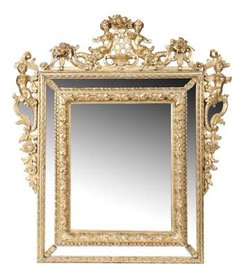 the rectangular mirror plate within a foliate carved frame and margin plates, surmounted by cresting of mermaids, C-scrolls, fruit and flowers, the reverse bearing Leeds City Art Gallery & Temple Newsom House exhibition loan label dated 1948