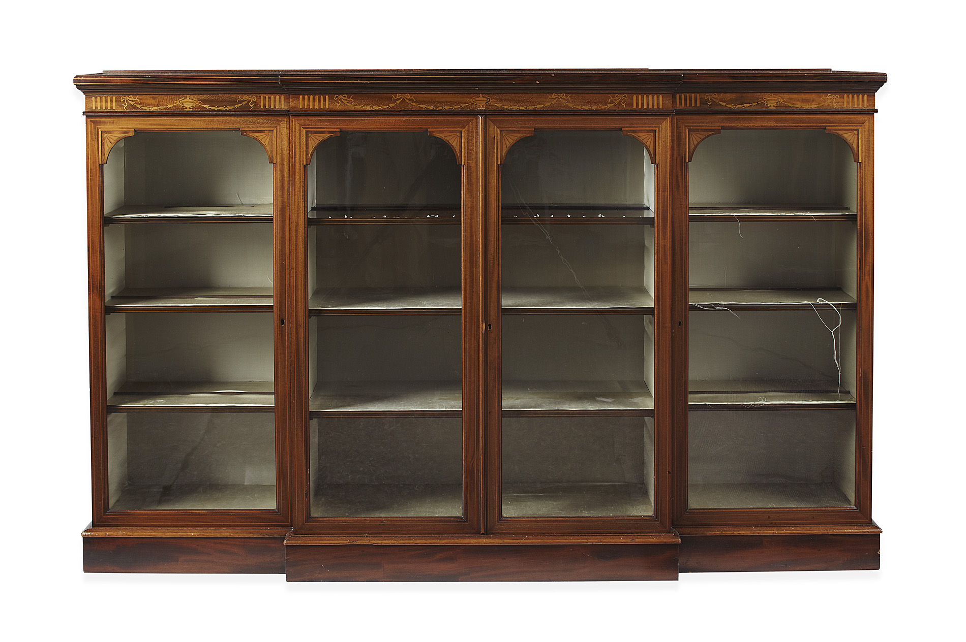 EDWARDIAN MAHOGANY AND SATINWOOD INLAID BREAKFRONT LOW BOOKCASE