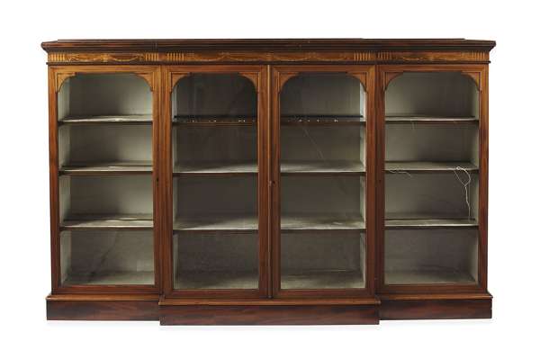 the breakfront top with fan medallion inlay over a frieze inlaid with ribbon tied bellflower garlands and urns, over a pair of glazed doors flanked by further glazed doors opening to a cream satin lined and shelved interior, on a plinth base