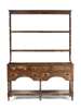 the moulded cornice over two open shelves and scroll cut side supports; the base with three short drawers and four further short drawers separated by an arched apron, raised on turned legs joined by an undertier
