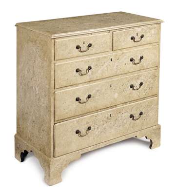 the moulded rectangular top above two short and three graduated long drawers, raised on bracket feet