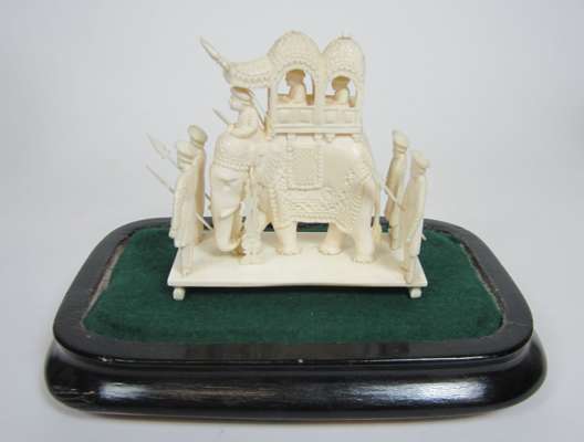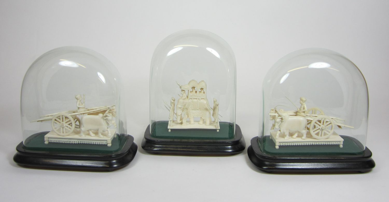 each displayed in a glass dome on an ebonised base, comprising of: a group modelled as men riding an elephant, flanked by attendants, 10.5cm wide; and two similar groups, each modelled as a man riding a cattle-drawn cart, 15cm wide (3)
